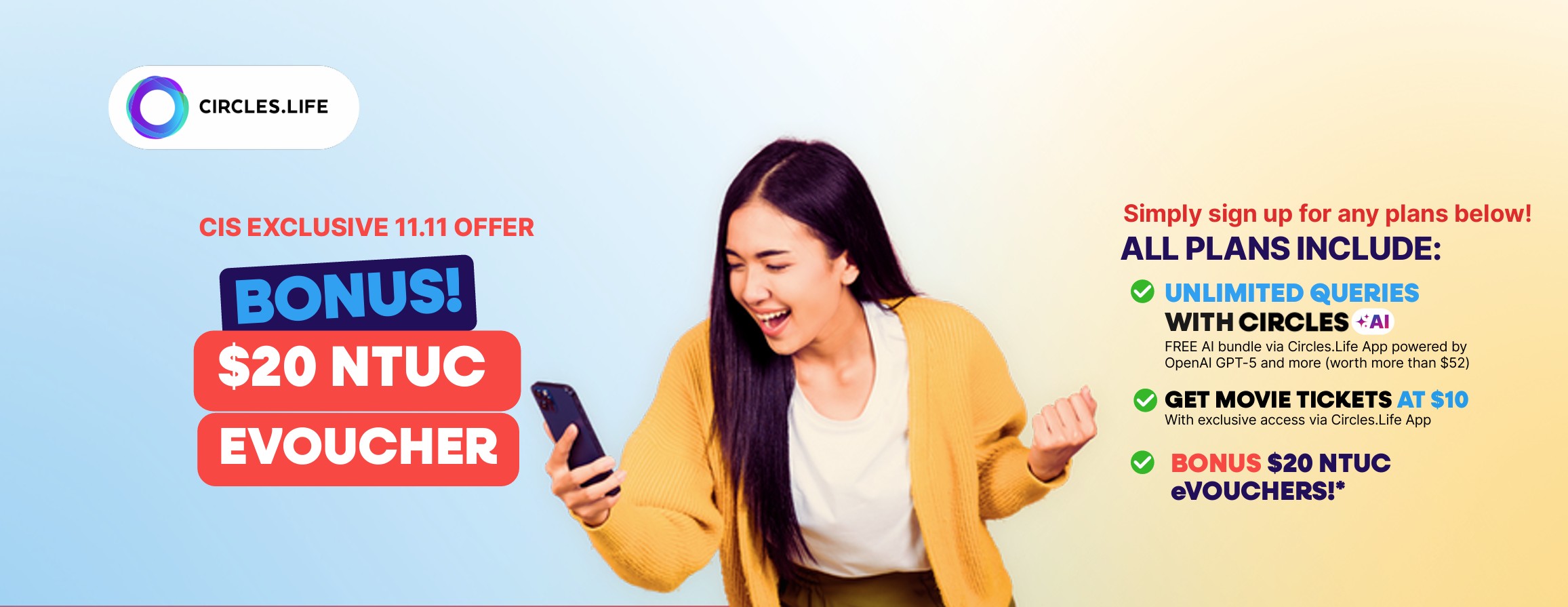 This November, sign up for an exclusive Circles.Life CIS plan and receive $20 NTUC eVouchers – while stocks last! Enjoy unlimited talk time, unlimited queries to CirclesAI tool, caller ID, Golden Village movie tickets valued at S$10, and more! |